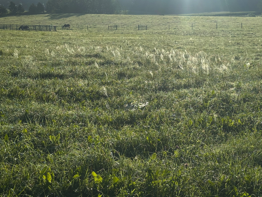 I will miss emerging from the trees while walking Asher in the morning to find an amazing number of mystical-looking spiderwebs that were woven overnight, hanging vertically in the tall grasses of the back pasture.