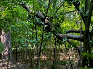 Right now, I’m feeling inclined toward leaving it as it is. The upper portion is well above my lumberjacking abilities. Maybe after all the leaves are down it will become easier to assess the tangle of small trees that were victimized by the crash. I’ll gladly delay a decision on what to do until some time in the future.