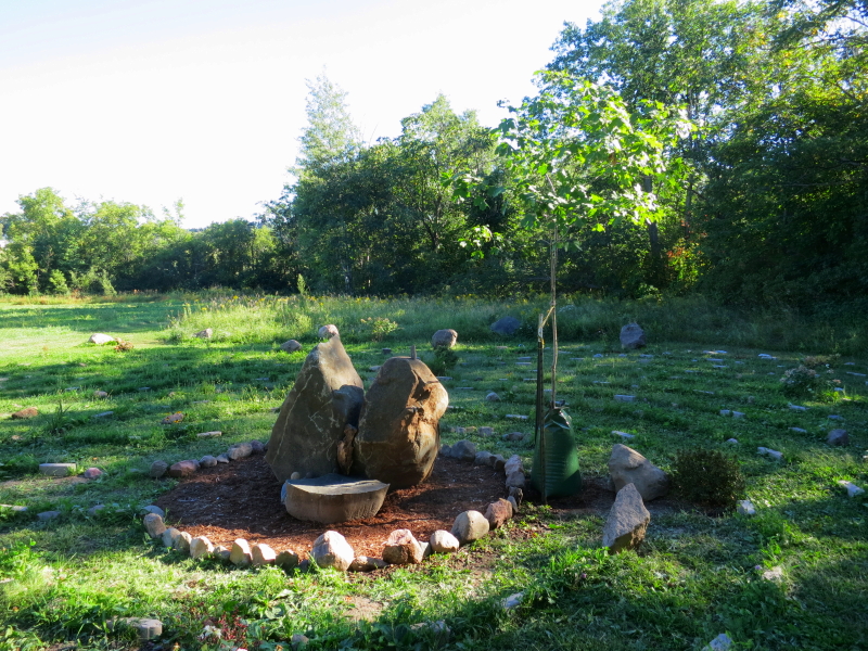 If you look closely, you just might be able to spot the transplanted maple tree by the large rock at the center of the labyrinth. It appears to be holding its own in this first summer out in the open sunlight.