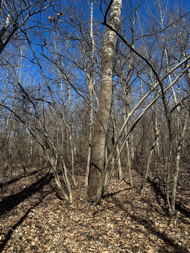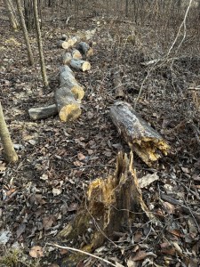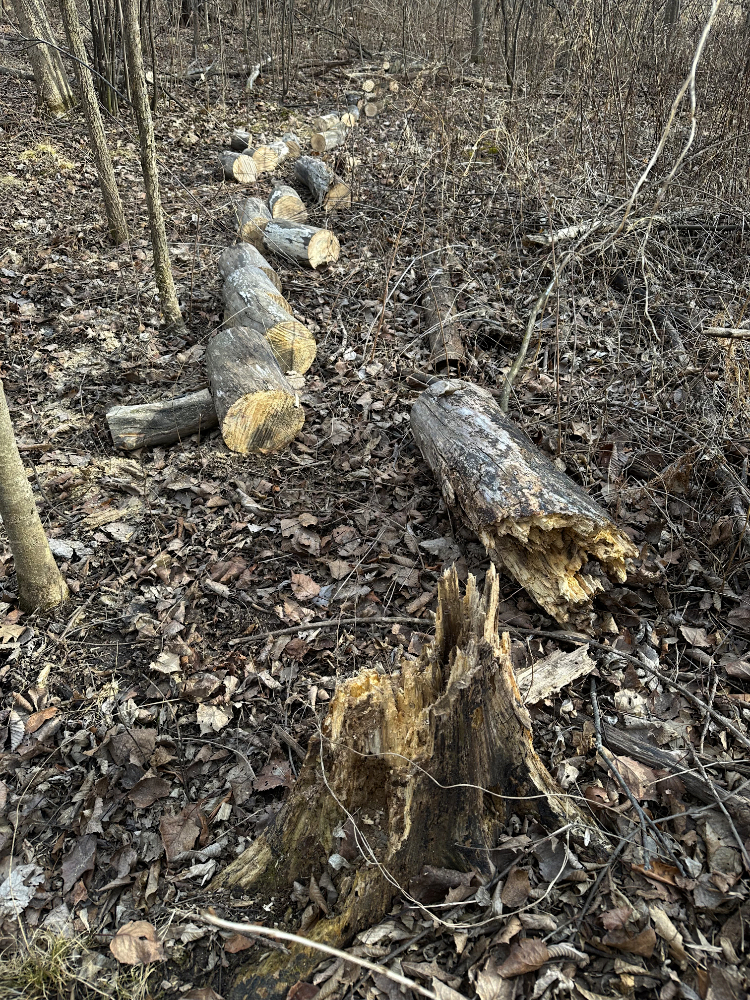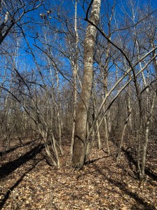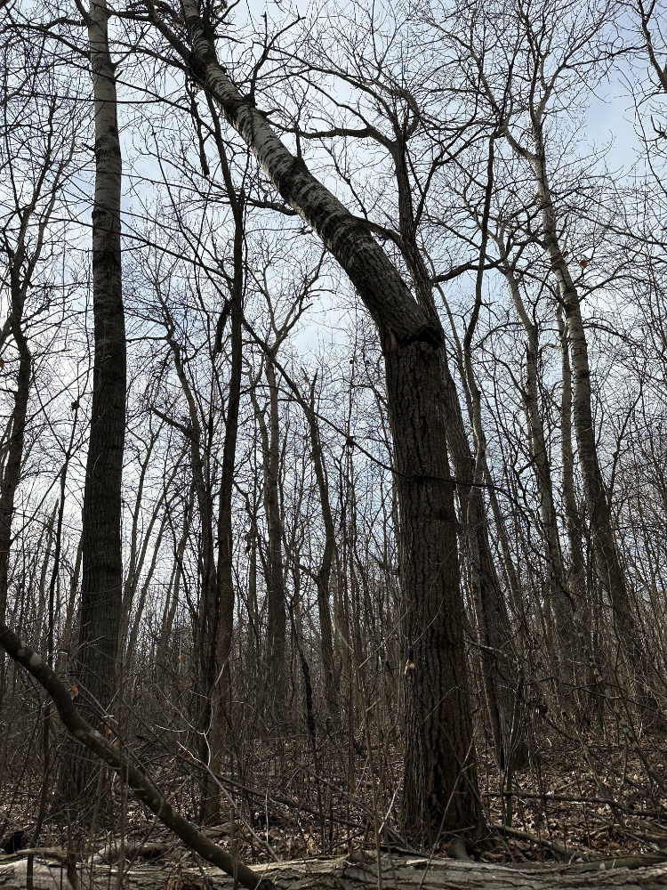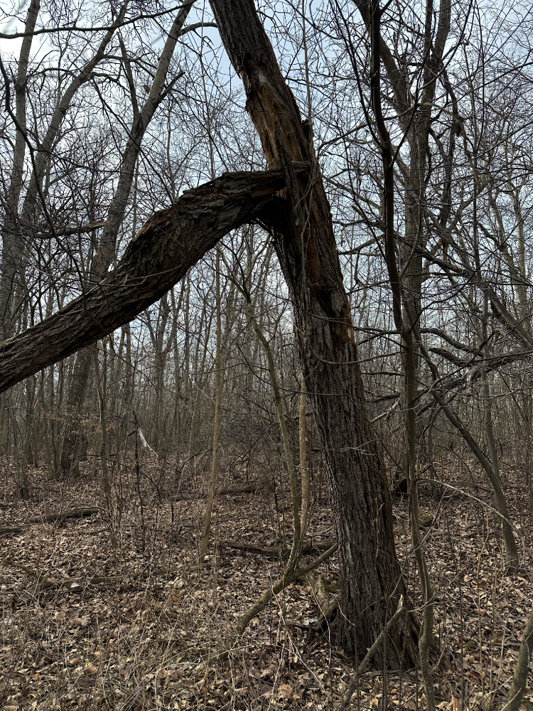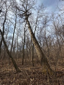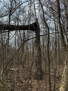 This time of year, it is easier to spot the trees that have broken or tipped and are hung up in surrounding branches. The large poplar in this photo is a doozy. That break is probably 10ft(3m) or more up from the ground. I won’t be taking a chainsaw to this challenging widow-maker.
