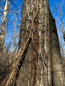 I have a pretty good handle on identifying the three leaves of poison ivy plants and have never seen any greenery on these hairy vines on the trees, so I never connected the two. Also, I have never experienced a rash outbreak after messing with the vines in the woods, which surprises me since I react pretty easily when having contact with the low-growing plants in the sunny expanses around our property.