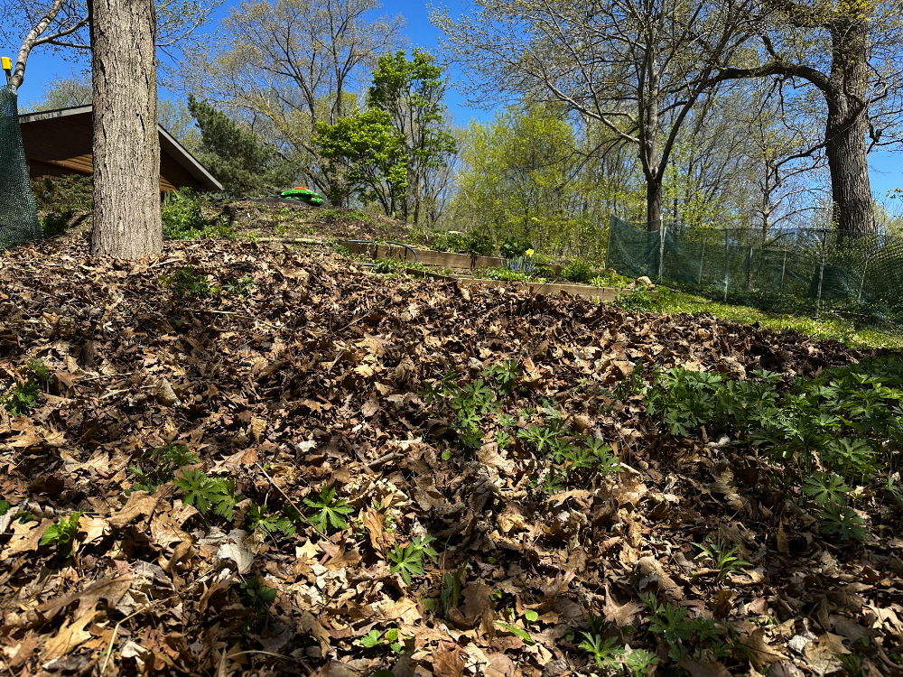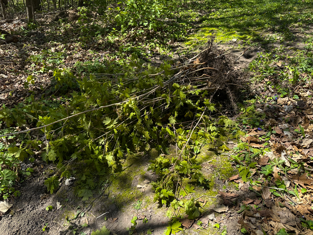 The pile of little maple trees I had harvested shows that I was able to pull quite a few of them up by the roots. I much prefer doing it that way whenever possible, but it takes a toll on my hands, wrestling with stems that almost come free but eventually require a tool. When we have to cut the stem at the ground level, it usually leads to needing to come back later and cut again after new shoots appear from the same root system.