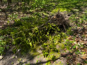 While walking through the woods yesterday with Cyndie and Asher, we decided to knock down as many of the broken and tipped trees and branches as we could reach and deal with using my pruning saw. Inadvertently, that ended up including freeing up some trees from the grip of vines as we came upon them. For as much energy we have put toward de-vining our trees over the years, it continues to surprise me to find how many we must have overlooked. In addition to that, there are plenty where vines were cut out previously but have resprouted, requiring another round of attempted eradication.