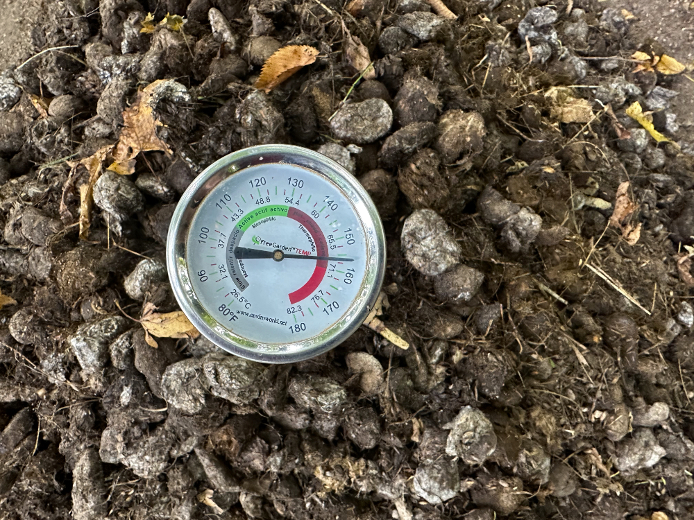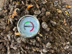 After a recent turning of an old pile, I was thrilled to see the temperature had climbed back to over 150°F in the middle, indicating the microbial breakdown activity was far from complete.