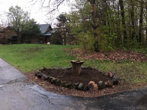 The grape-vine covered bird feeder that tipped over this spring due to a rotted cedar post created a void that Cyndie had planned to fill with flowers. Now, the inverted stump-turned-planter is going to be the centerpiece of that new display.
