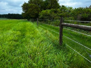 In addition to regaining the upper hand on our trails, I think I mentioned that I’ve worked some fence lines, too. Yesterday, after I got home from a successful morning of shopping, I strapped on the Stihl power trimmer and headed to the far side of the hay field to make the fence visible again.