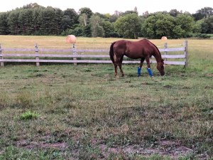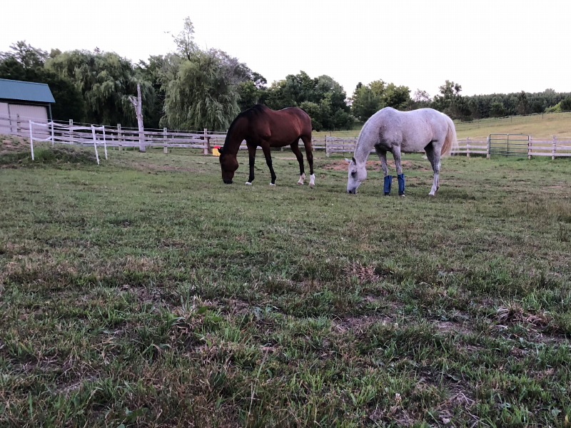 The horses are doing their part to keep the paddock grass beautifully mowed.