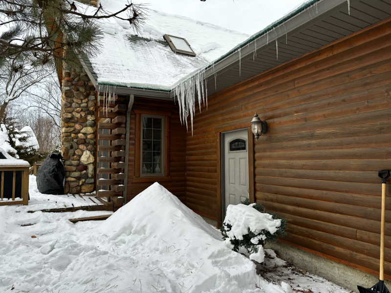 The roof hadn’t dried up at all since the last mix of freezing drizzle and snow had coated the shingles. If I could just make my way to the narrow slope of dry shingles under the eave of the main peak, I figured I could safely stand on the step ladder already straddling the lower peak.