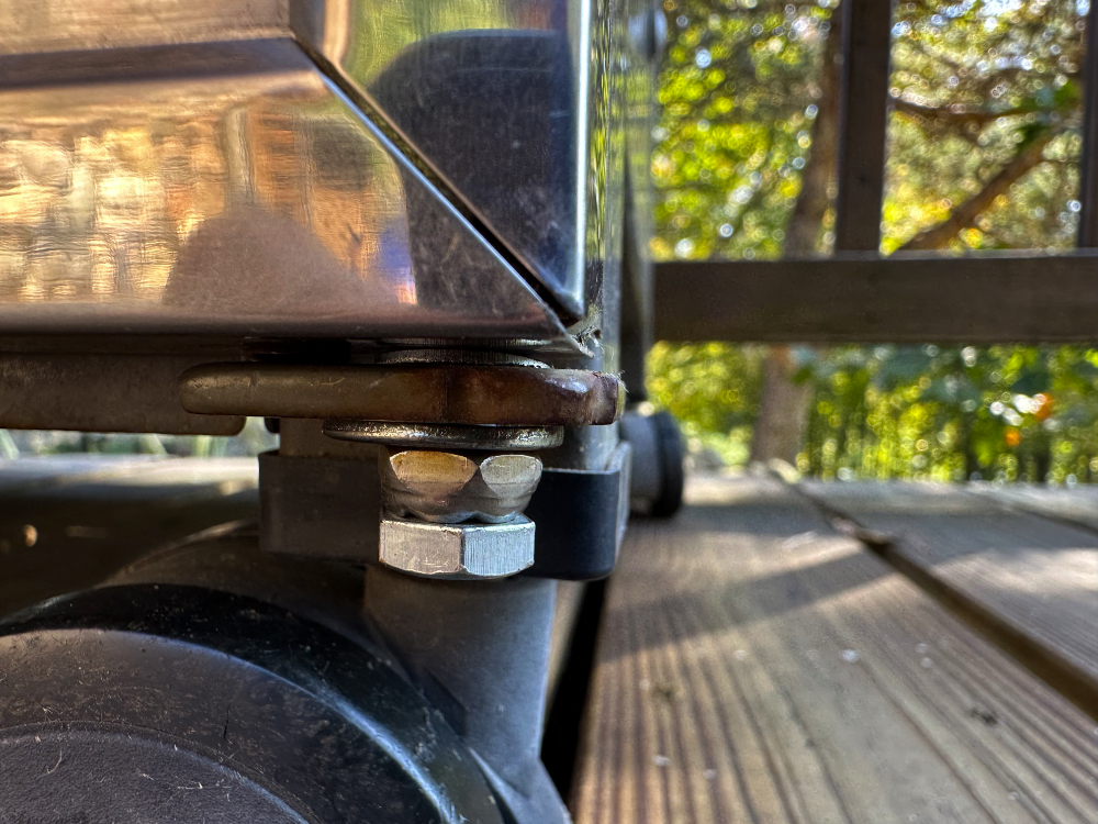 We were moving our gas grill off the deck when one of the doors fell to the ground. Cyndie found a bolt with a nut on it lying there, but I couldn’t figure out what had broken or how it had been attached. As far as I could tell, the bolt was just functioning as a post that the door pivoted on. First impression was that a new bolt would solve the problem, but I knew it was more complicated than that.