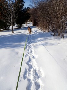 The snow is crusty, not very deep, and rather uninviting for romping around. That’s not all bad, though. I’ve needed to do less plowing and shoveling, and walking the trails with Delilah can be done without putting on snowshoes.