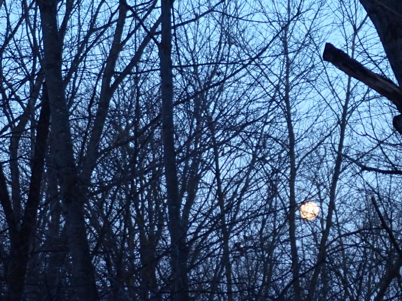 Referring back to my recent post about feeling maladjusted to real cold, this morning’s walk was extremely refreshing at -1°(F). The big moon was low in the west and lit up brilliantly by sun rays that hadn’t crested our horizon yet. I hastily tried to capture a shot with the new Olympus pocket camera while standing on the trail down to the northwest corner of our property.