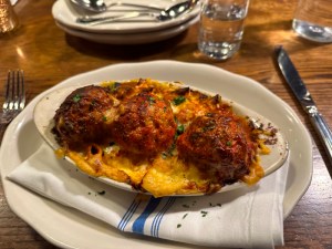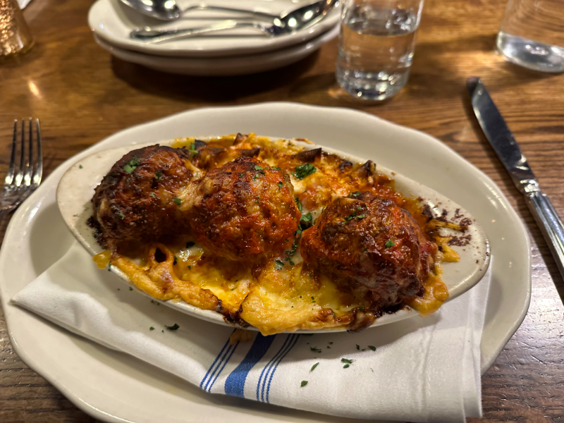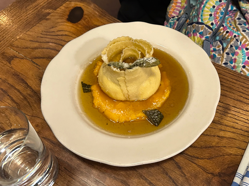 On the left, Pappardello with yam puree, whipped ricotta, honey, and sage. To the right, Baked Garganelli of wild boar meatballs, rosemary sugo, Fontina, Taleggio. Delicious.
