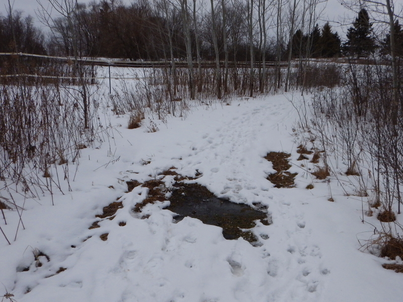 Even with the temperatures back under 32° (F) all day and night again, there is water on one of our trails that hasn’t re-frozen. I can only guess that it might be because there is enough volume moving past that spot toward lower ground. Flowing water is more resistant to freezing.
