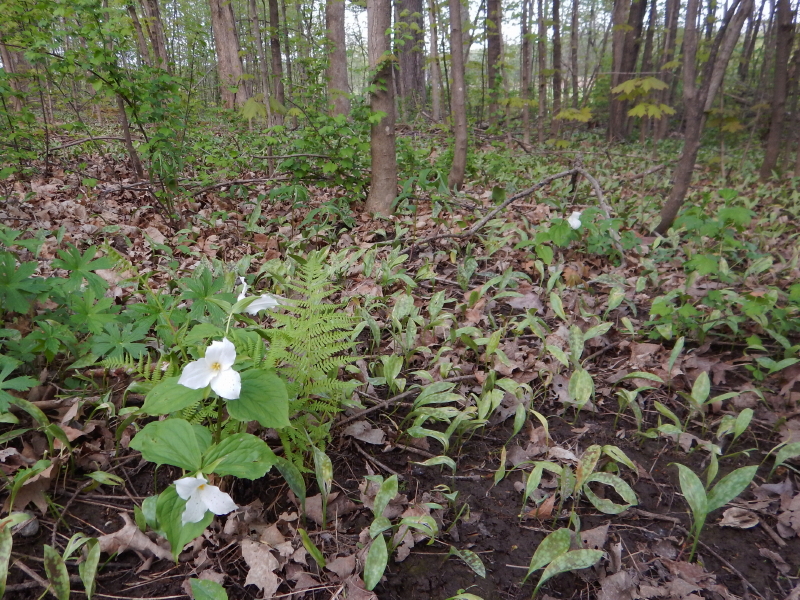 The multitude of flora on our property is springing forth at a variety of rates this year. To our surprise, some of our trillium are flowering earlier than we’ve seen before. That’s particularly thrilling for us because most of the bloomers are transplants we brought from Cyndie’s family vacation home up north.