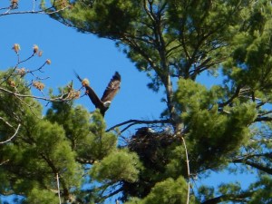It is possible the nestlings just hatched. They were making quite a ruckus and we wondered if it had anything to do with our presence. When the eagle on the branch flew off, we began to speculate about the possibility the noisy eaglets were reacting to feeding time.