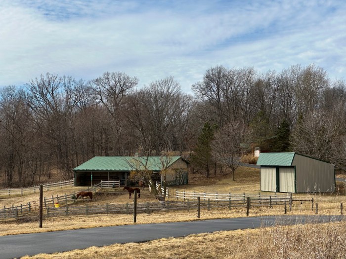 It shows how the hay shed doors capture the sunlight. You can see how the barn is positioned so the overhang is protected from winds out of the northwest, both from its orientation and the fact it is tucked beneath higher ground behind it with plenty of tall trees providing additional windbreak. Just above the roofline of the hay shed is the shop garage. Uphill from that garage and directly behind the barn from this vantage point is where our house is located.
