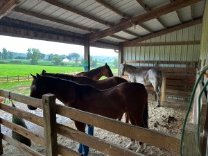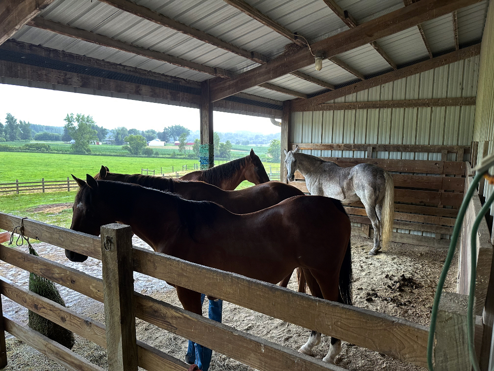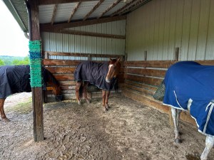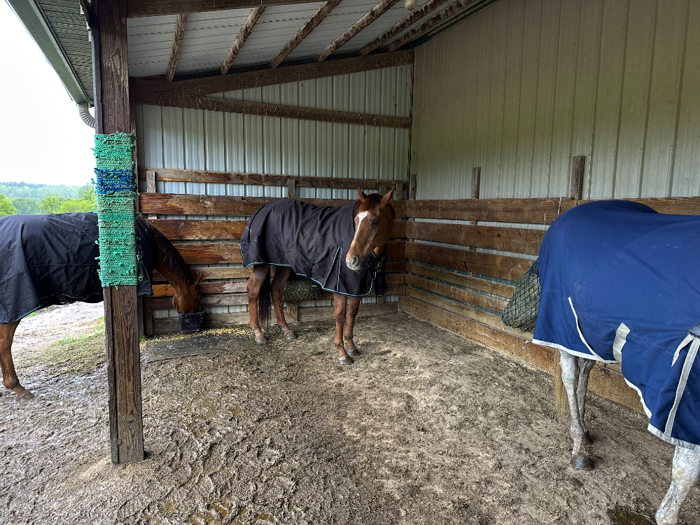 Every time the other three don’t chase Mia out from under the roof line during bad weather is a victory in our eyes. I had to capture the moment with a photo. Of course, the whole other side was wide open for shelter, but for some reason beyond my understanding, the horses seem to have an aversion to taking advantage of such a simple solution.