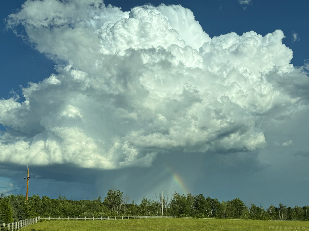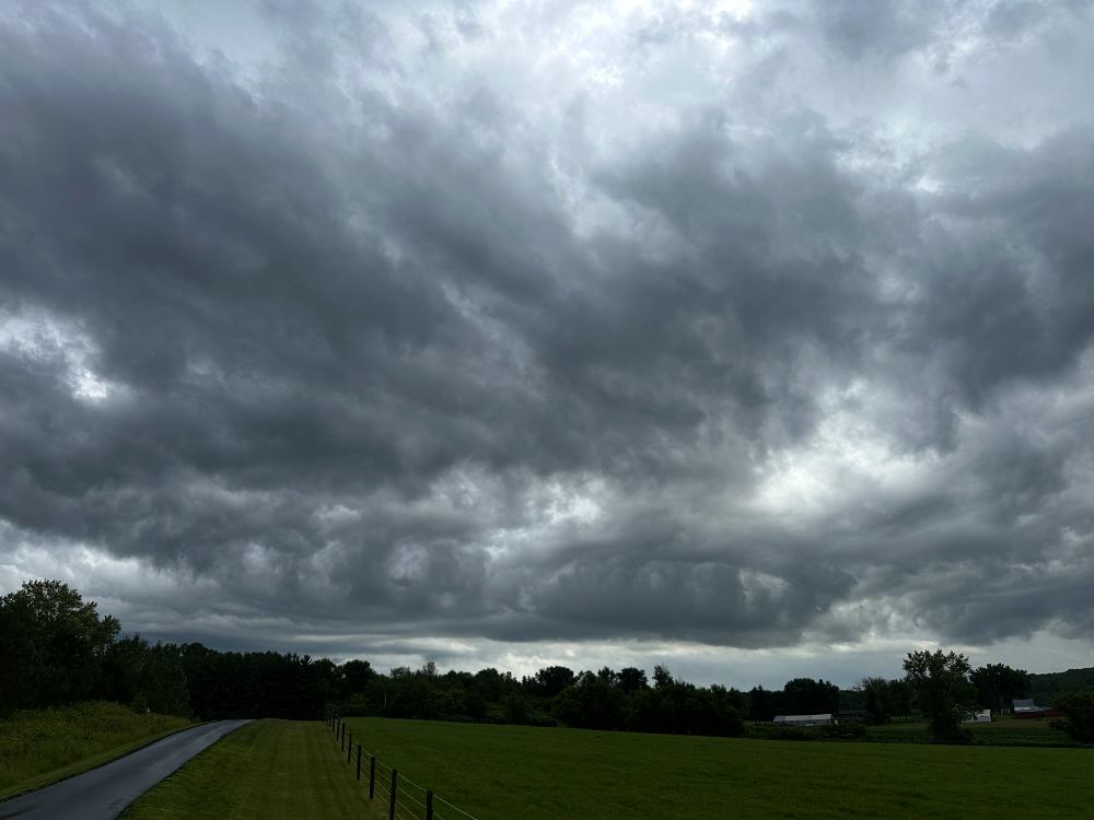 What a day of weather we experienced at Wintervale yesterday! Despite all the fence trimming I was hoping to accomplish, the repeated downpours we received prevented me from achieving that goal. The dew point temperature was in the low 70s°F when we woke up, and none of the storms throughout the day did much to change that. The air stayed thick, feeding that energy to the waves of storms that rolled over, one after another.
