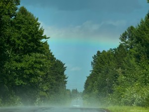 The sun was getting lower, but the surrounding areas of blue sky allowed enough light to illuminate another entertaining rainbow(s) that Julian caught while I drove.