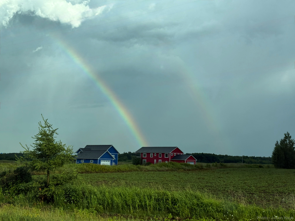We scrambled to get into the car before the fat, early drops became a soaking shower. As we drove toward Hayward, the wet road told a story of a significant downpour that must have just happened moments before. The combination of the whopping dose of precipitation and the large areas of wide open sky around the closest bursting cloud produced the widest bands of rainbow colors any of us had ever seen.