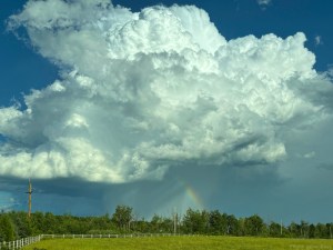 The rain suddenly paused just long enough that the feed delivery was completed without getting soaked. The driver said that wasn’t the case on his prior stop, after which he followed the storm the whole way to our place, watching the brilliant lightning strikes on the back edge of the squall. While I was standing with the horses waiting for him to arrive, we witnessed one of those fascinating strikes split into two zagging streaks, followed so closely by the bang of thunder that both the horses and I flinched because it felt too close for comfort.