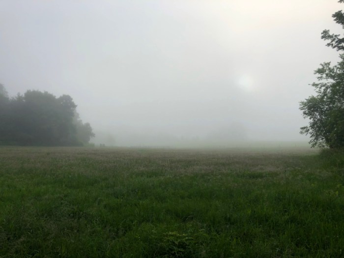 Yesterday morning at our place felt rather otherworldy. We walked out into a landscape that looked like we no longer had any neighbors. Our high dew point temperature was making it feel remarkably tropical. There were so many droplets falling from the tree leaves it sounded like it was raining in the woods. A thick fog was obscuring the view of anything beyond our property lines.