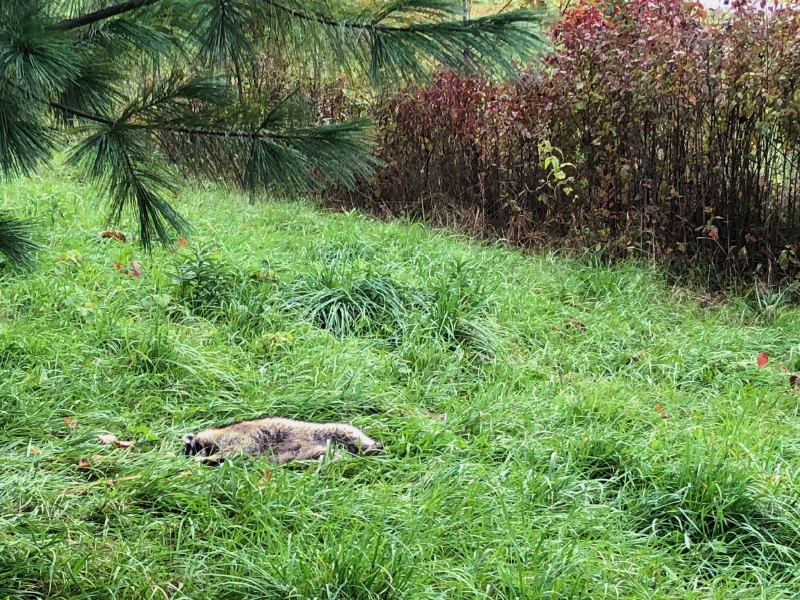 I don’t think it’s rain that is bothering the raccoon that has become a permanent fixture in the grass beside our north loop trail.