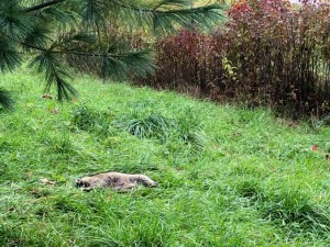 We are leaving it alone because we aren’t sure if the problems it seems to be having might be related to rabies. There is an outside chance it was hit by a car and made its way from the road to that spot, but we are keeping our distance and letting nature take its course, regardless.