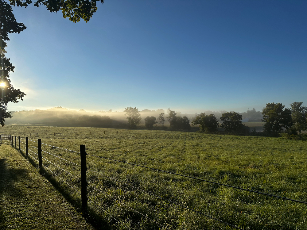 As we emerged from the woods this morning on our rounds, it was hard to tell whether the moisture droplets on the horizon were steam rising up from the heat of the rising sun or fog settling down toward the ground.