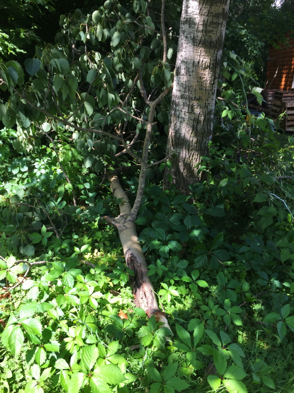 It wasn’t long enough to reach the critical point from the ground, but I was able to trim and bring down the bulk of the tree.
