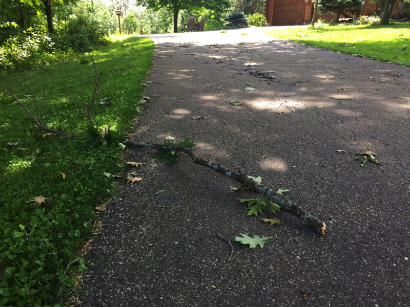 Beyond that, the most visible evidence of Saturday night’s drama is the amazing number of leaves, sticks and small branches that litter all surfaces that were downwind of the trees.