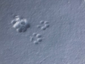 After our last meager accumulation of snow, we have had a few days of high winds creating small hard-packed drifts that serve as perfect surfaces for wildlife tracks. Using Delilah’s prints (that mostly break through the crust) for reference, I can tell the other recent traffic was smaller than her. And me.