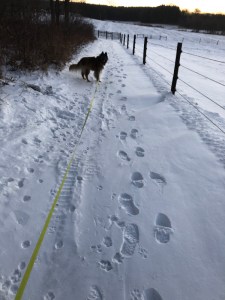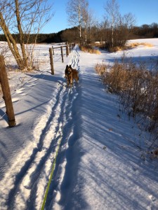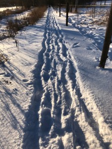 In the last week, we have received a series of overnight snowfalls when the temperature has been very cold, bringing an inch or two of light powder each time, which has been enough that the trails we walk have needed to get re-packed every other morning. If we were to walk down the middle all the time we would end up with a rather narrow “aisle” of travel through the accumulating snow cover, so I make a concerted effort to walk the edges after new snow in order to keep the packed path nice and wide.