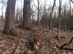 The narrow path we cleared through the middle of our woods –which we’ve taken to calling the “middle trail”– has become our new favorite. After frequent commands to Delilah to “take the middle trail,” she now hesitates when we approach it, anticipating the call. There are plenty of times when I am more than happy to let her choose our route and leave it up to her as to whether we make the turn or not.