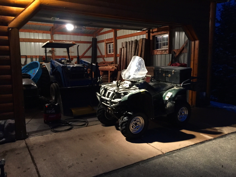 Just in case the skies do unleash a measurable amount of frozen flakes, I took some last-minute steps last night to have the Grizzly ready to clear the driveway. Off came the summer tires, replaced by the more aggressive tread of the winter set. Then I attached the snowplow blade and backed the ATV into place.