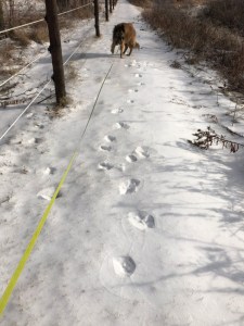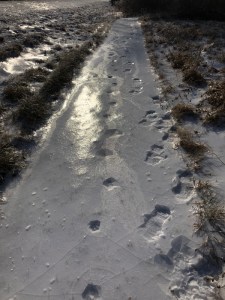 Each step broke the crust and sent fragments sliding across the icy surface around us. Poor Delilah ended up standing in her own pee because it flowed in every direction on top of the glass-like surface beneath her.