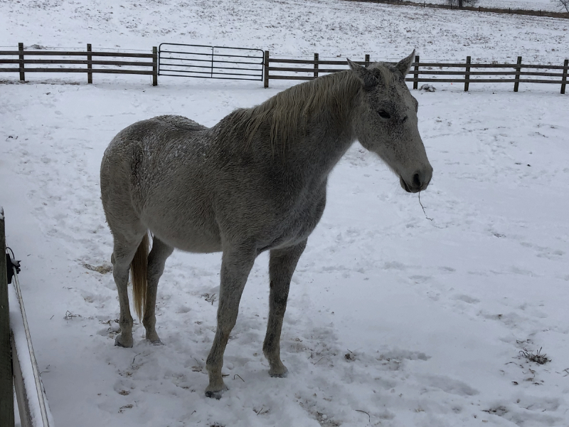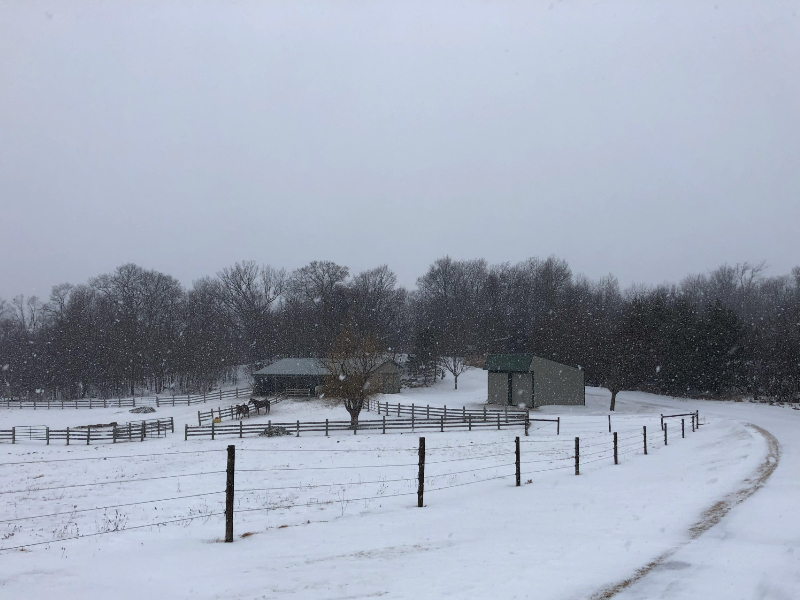 Oh, the weather outside is frightful… My first clue was that the door didn’t open when Delilah and I intended to step out yesterday morning and she bonked her nose on the glass. We had been out that door the night before on her final walk before bed and stepped into a windy snowstorm. At that time, I decided we should walk down and check on the horses.