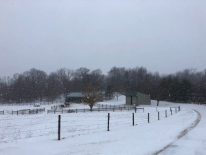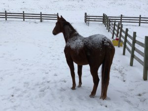 Delilah wasn’t really all in for that because she just wanted to do her business and race back inside. We trudged through the blowing snow to the barn and I made her wait while I attempted to convince the two chestnuts they should come over to the big paddock so I could close some gates and split the herd in two for the night.