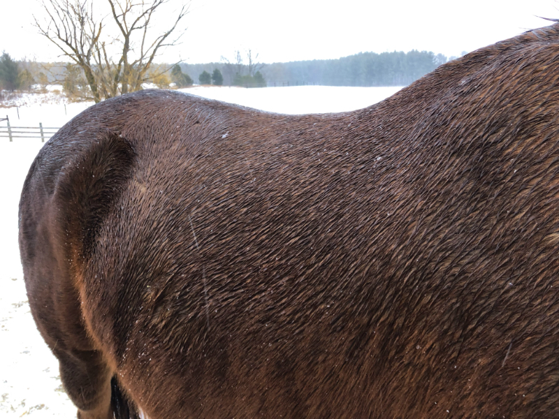 After a few days without blankets, I covered the horses back up on Monday while they were dry to give them some protection from the wetness that arrived yesterday. Now, just because they have blankets on, that is no reason to become heedless of the elements.