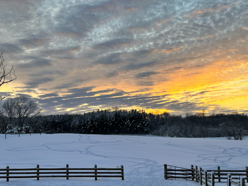 Apparently, the horses were just waiting for nightfall to venture out into the deep snow covering the hay field. Their meandering trails made for an interesting pattern beneath the colorful dawn sky yesterday morning.