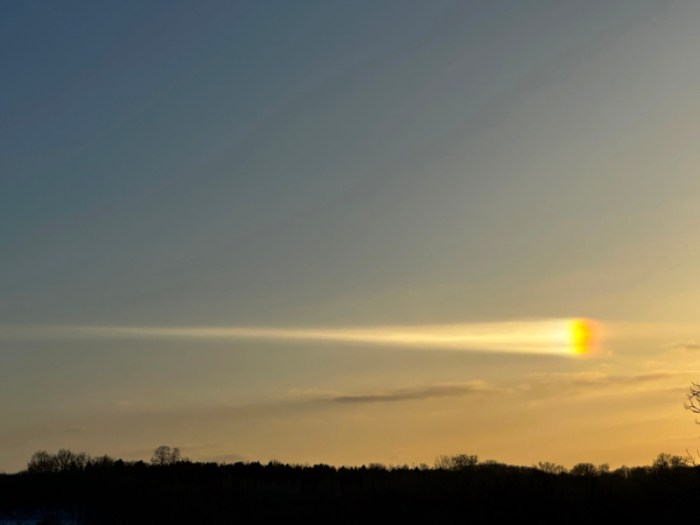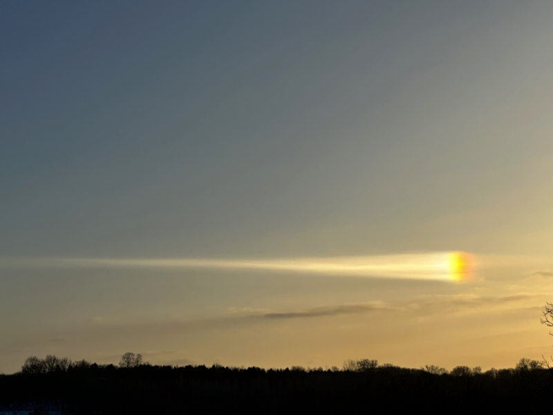 A day or two later, an unexplained streak of cloud (remains of a contrail?) caught my eye because of the fiery refraction of sunlight at the end.