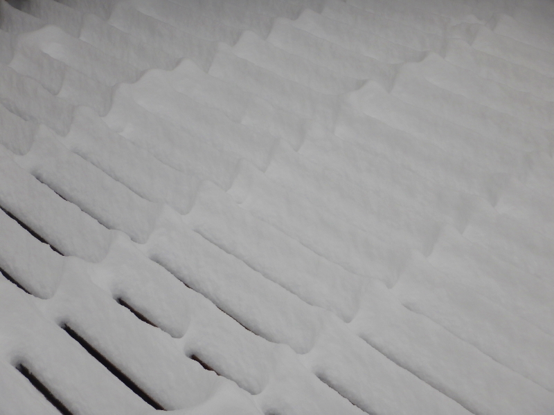 The deck ended up with a fascinating snowscape of waves and lines unlike anything I remember seeing before. We have ended up with a variety of interesting patterns over the years, but never one with peaks so tall while the slots between remained wide open.