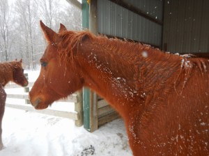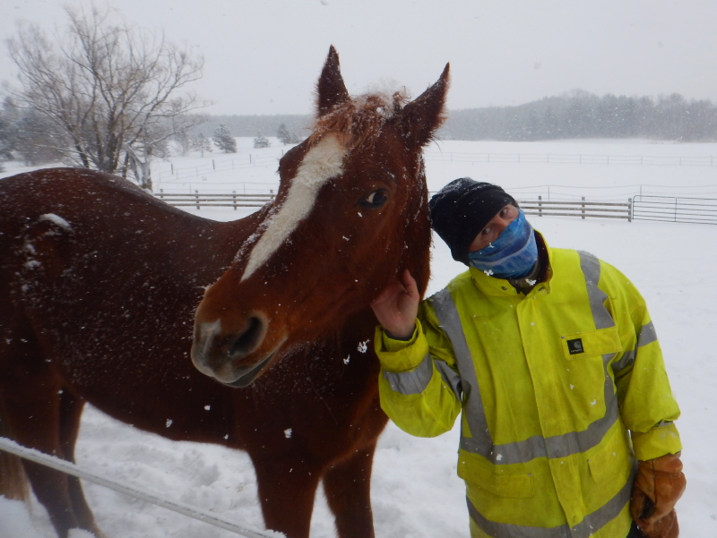 I took a little break to see what the horses thought of all these flying flakes. Cyndie caught a picture of Dezirea and me giving each other the eye. I think the horses were growing weary of the long duration of snowfall.