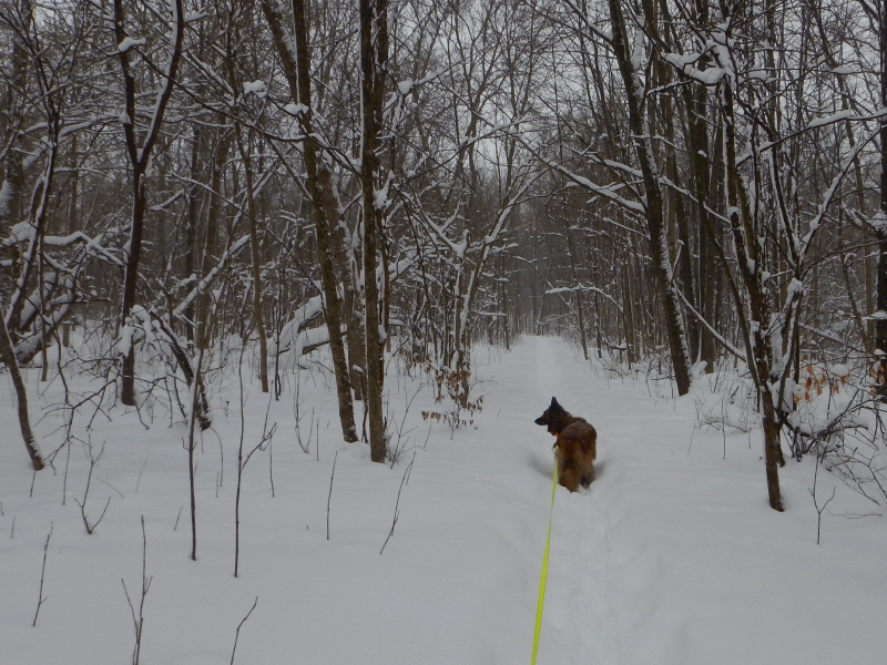 I got out the snowshoes to walk Delilah on our trails through the woods. She was so fired up to be out in the deep snow that she wanted to run, but I couldn’t keep up with her at that pace. I felt bad slowing her down.