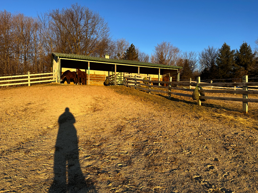 It is not impossible to function at -14°F (-25°C), but it can be a bit of a hassle to tie up hay nets and distribute buckets of grain –one of which now gets watered down— in such extreme conditions. I am very happy that Asher showed a keen sense of efficiency and adapted perfectly to my plan to shortcut our morning walk and get his business out of the way as swiftly as possible.