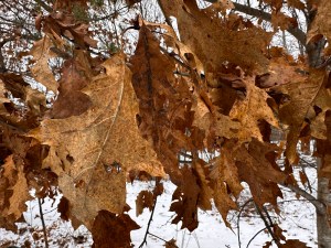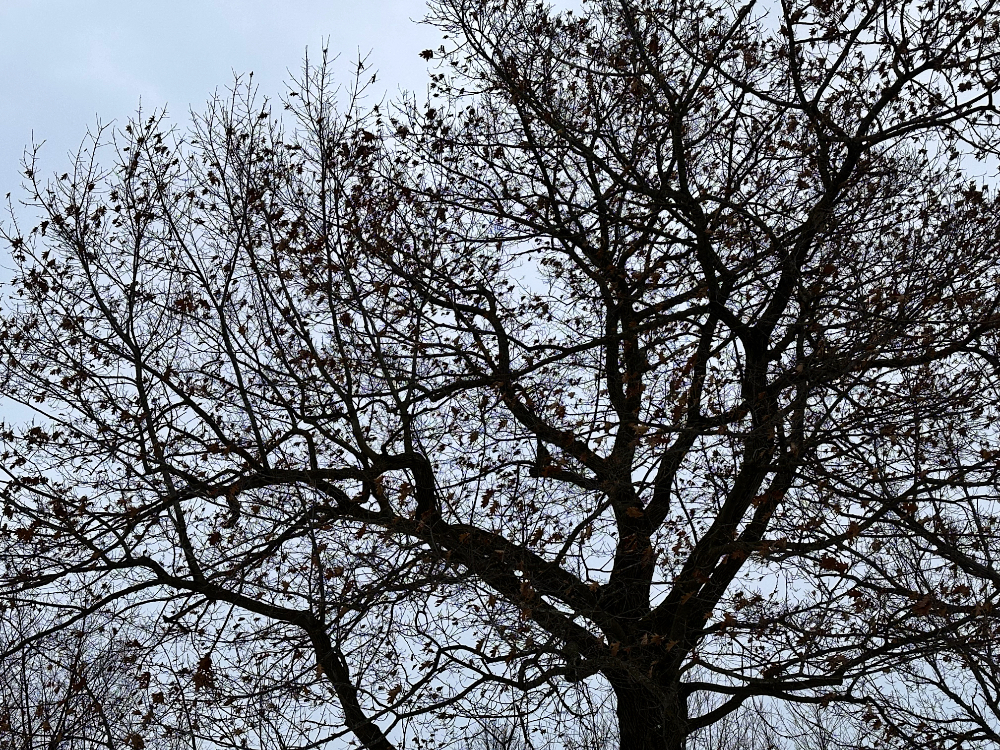 There aren’t many leaves left clinging to all those branches. On the other hand, there are still more leaves up in that tree than I could count.
