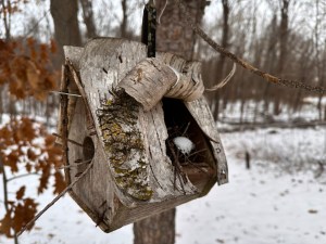 There is also a birdhouse with a birch bark roof that features an opening that wasn’t there when initially built.