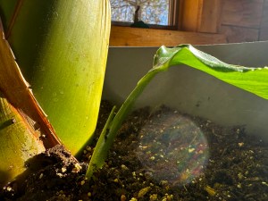 Indoors, our bird of paradise plant is showing a new sprout on the stem of the smallest leaf. It’s a wonderful compliment to the deep freeze outside.