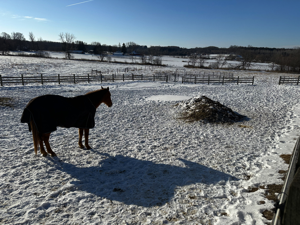That manure pile is my attempt to build a mound over the drain tile from the barn water spigot to keep them from squishing it. The water that drains from it creates that icy patch that the horses know to avoid.