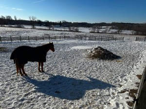 I’ve pointed out many times the icy patches in the large paddock that the horses avoid. Here is Mia soaking up the morning sun where you can see the horses cover a lot of the ground except for where they don’t: